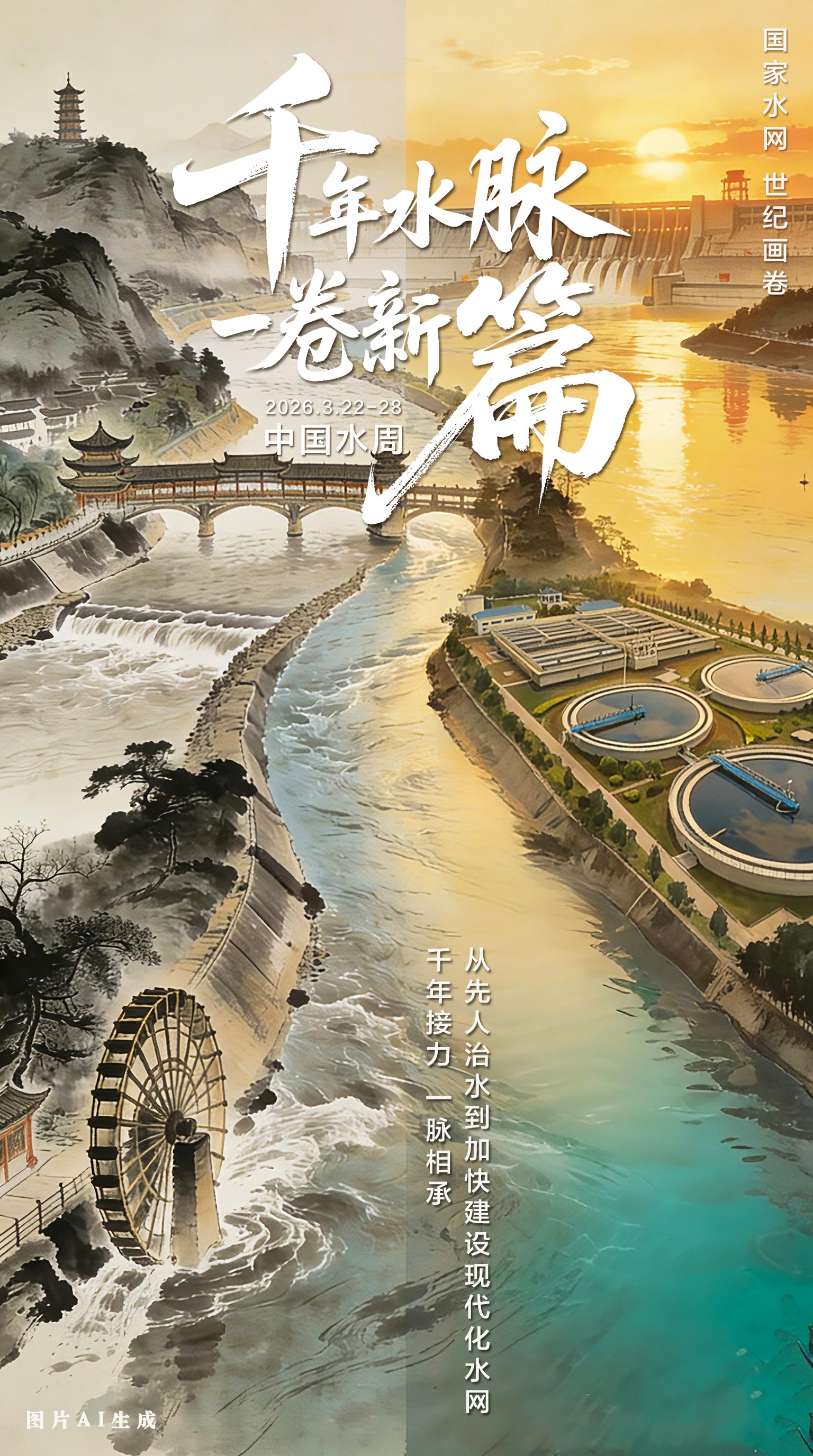 2026年3月22日至28日,第三十九届“中国水周”如约而至。今年主题为“国家水网 世纪画卷”。 从古人凿渠引水的智慧,到如今现代化水网的宏伟铺展,中国人治水兴水的脚步从未停歇。一幅更加宏大、系统、智能的国家水网正加速铺展。 我国形成了世界上规模最大、功能最全、惠及人口最多的水利基础设施体系。 国家水网覆盖率达80.3%,94项重大水利工程竣工验收投入运行。三峡工程持续发挥巨大效益。新增水利工程供水能力318亿立方米。 2025年11月2日在湖北省宜昌市拍摄的三峡大坝和三峡电站外送输电线路(无人机照片)新华社发(郑家裕摄) 南水北调东、中线一期工程累计调水850亿立方米,汩汩清水北上、东流,沿线千家万户因此受益。 2025年12月21日在江苏省扬州市江都区拍摄的南水北调东线一期工程运盐闸、邵仙套闸、邵仙闸洞(无人机照片)。新华社发(任飞摄) 河湖生态环境有效复苏。全国重点河湖生态流量达标率稳定在90%以上,一条条河流重现生机,5522条(个)幸福河湖成为百姓家门口的风景,山河底色更绿更韧。 新华社照片,银川,2025年6月22日 在宁夏平罗县境内拍摄的黄河滩涂湿地(无人机照片)。新华社记者 王鹏 摄 水资源节约集约利用能力显著提升,每一滴水都更“物尽其用”。农业节水增效、工业节水减排、城镇节水降损的制度政策体系全面构建,用水权交易更加活跃,水资源费改税稳步推行。用水总量实现“零增长”。相较“十三五”末,农田灌溉水有效利用系数从0.565提高到0.583,初步测算万元国内生产总值用水量、万元工业增加值用水量分别下降20%和25%。。 农村供水保障水平实现历史性提升,农村自来水普及率达96%,规模化供水工程覆盖农村人口比例达71%,农村供水县域统管比例达72%。 民生润泽、岁月安澜的图景,就藏在家家户户的汩汩清水中,藏在每一条复苏的河流里,更藏在不断织密的国家水网之中。(图、文/刘佳、设计/于耀东) 来源:新华网