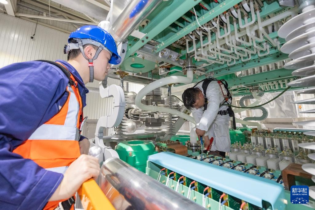 4月15日,检修人员在“疆电入渝”工程渝北换流站换流阀区域检修。新华社记者 黄伟 摄
