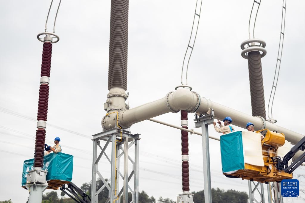 4月15日,检修人员在“疆电入渝”工程渝北换流站换流变进线区域检修。新华社记者 黄伟 摄